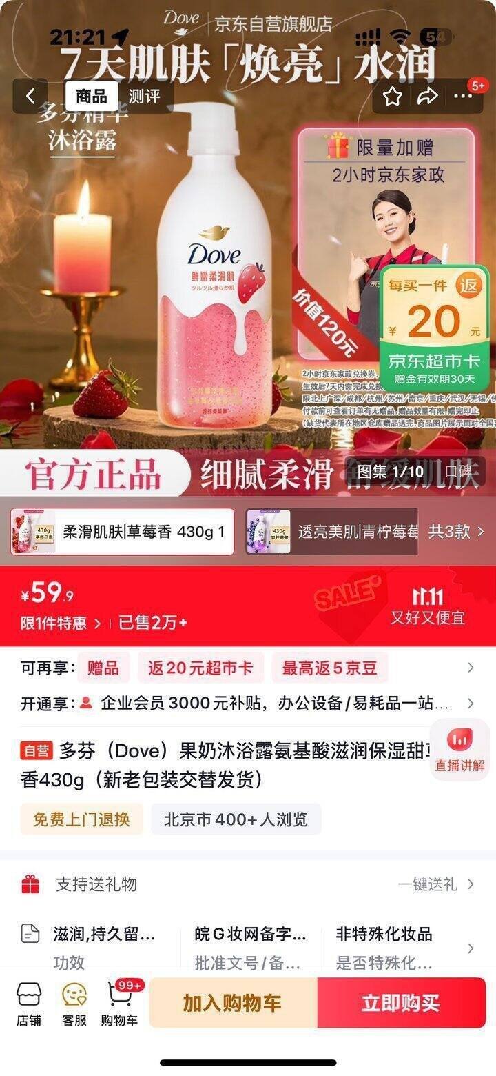 双11大促。沐浴露不仅送保洁而且送卡,多芬沐浴露50➕,送20元卡➕保洁2小时;