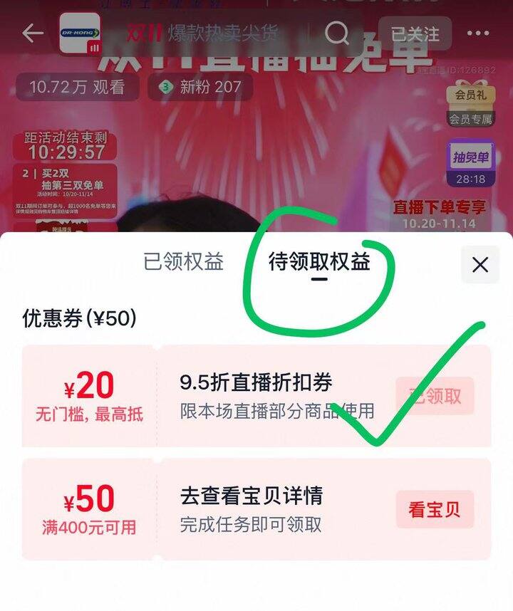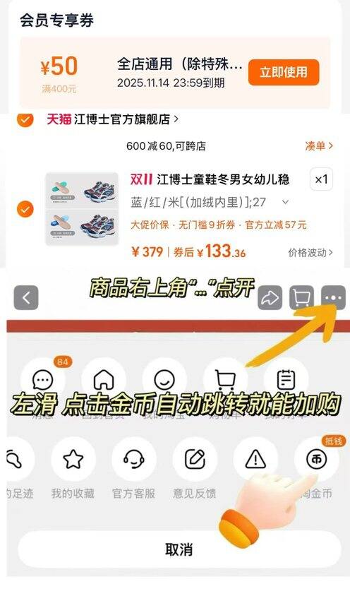 ❸去江博士店铺首页直播间,先领【9. 5折权益】,在直播间把你要的那双在加购一次