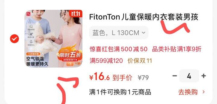 4件66.4 FitonTon儿童保暖内衣套装男孩秋冬羽绒羊毛蚕丝加绒秋衣秋裤