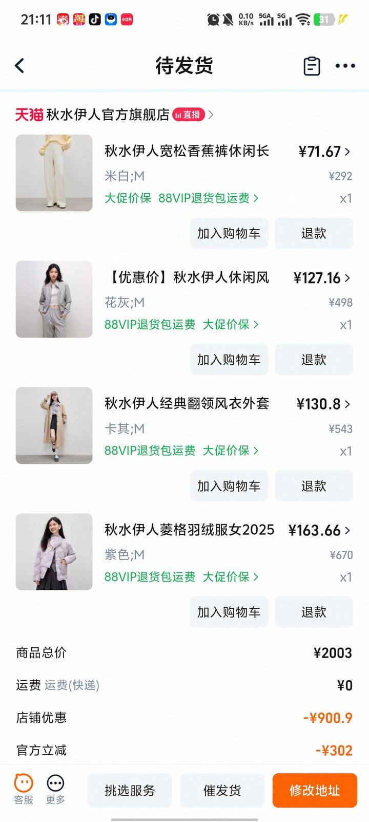 用到的优惠有2000-200服饰券,店铺首页2000-300店铺券,直播间有95折最高减20券,加上淘金币抵扣