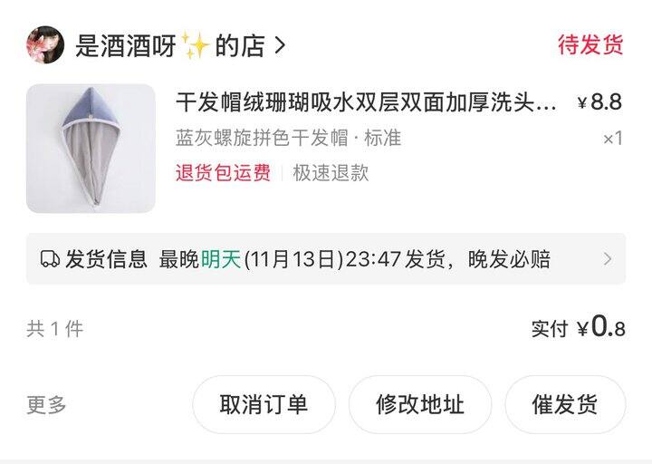 🍻干发帽:小红书搜干发帽攻略时跳了8无门槛,直接随意买了,替换目前吸水效果不佳的干发帽。进一出一,好用的话给家里也换一个。