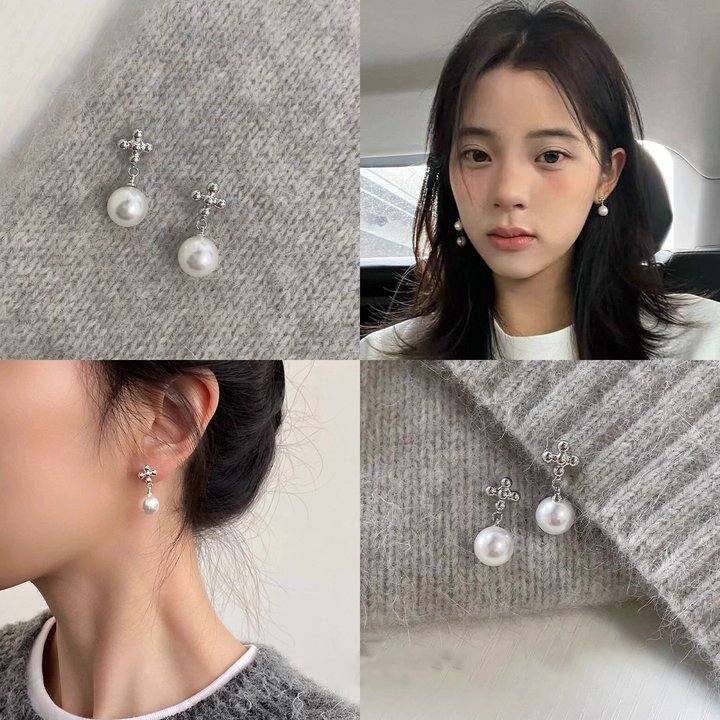 欧阳娜娜同款十字架珍珠耳钉女小众设计感独特无耳洞耳夹耳环耳饰