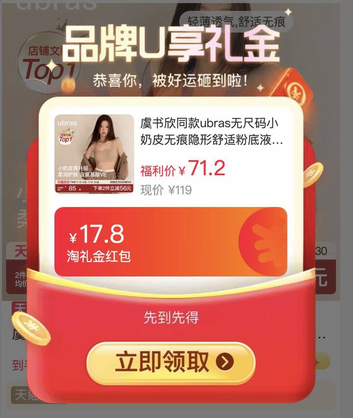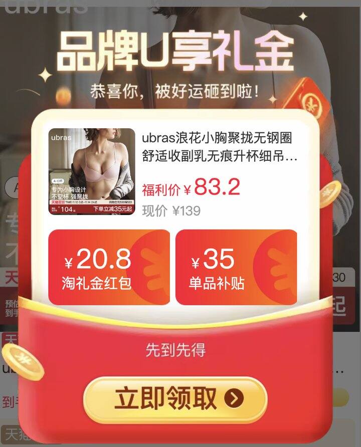 ubras浪花小胸聚拢无钢圈文胸: https://s.click.taobao.com/Tmdsrjp,领20.8淘礼金, 进入弹11元限时红包; 店铺首页首次入会领5元券,宝贝右上角 ··· 点开➠ 右下角“淘金币” ➠ 进入后点“足迹加抵”➠“浏览过”中找到宝贝加购物车;