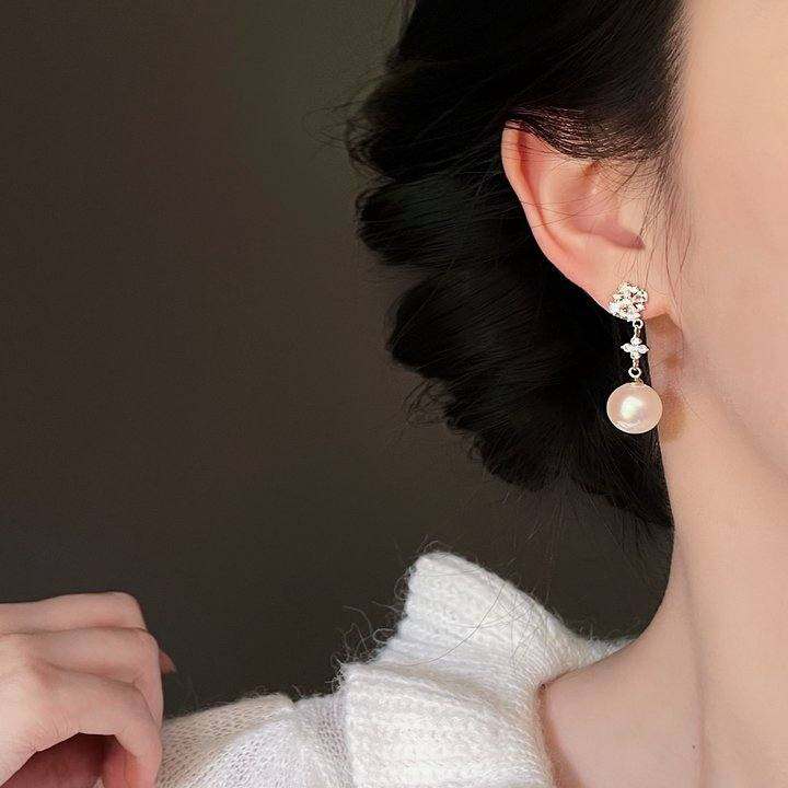 「花雪」气质长版粉光珍珠气质耳环蚊香盘耳夹无耳洞耳饰女耳针银