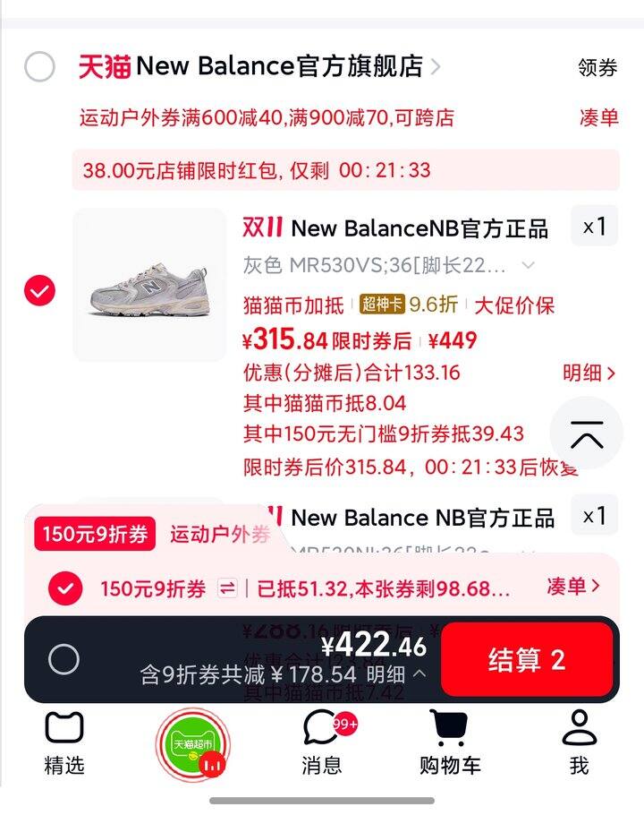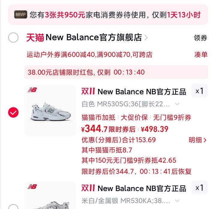 1、New Balance NB官方正品男女情侣银色复古运动休闲老爹鞋MR530KA:https://m.tb.cn/h.SsOwr6A弹84礼金
