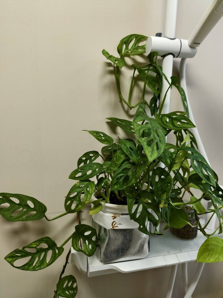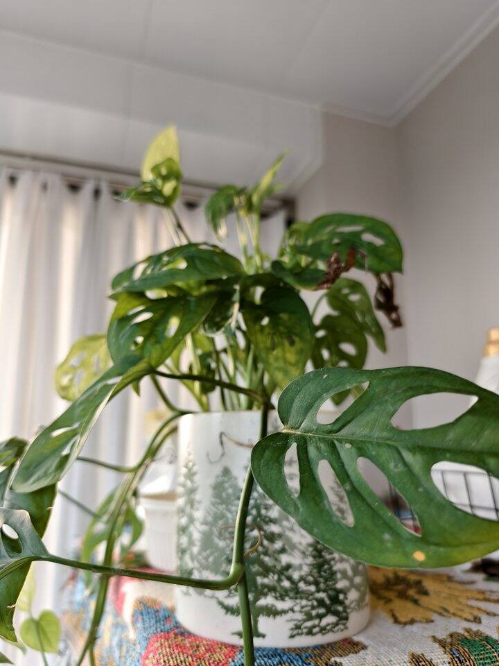 买了两盆,路口安利的店铺,放浴室的那盆长得很好,放餐桌的可能没阳光又不通风叶子有点焦边了,又被我放阳台洗衣机上边了。