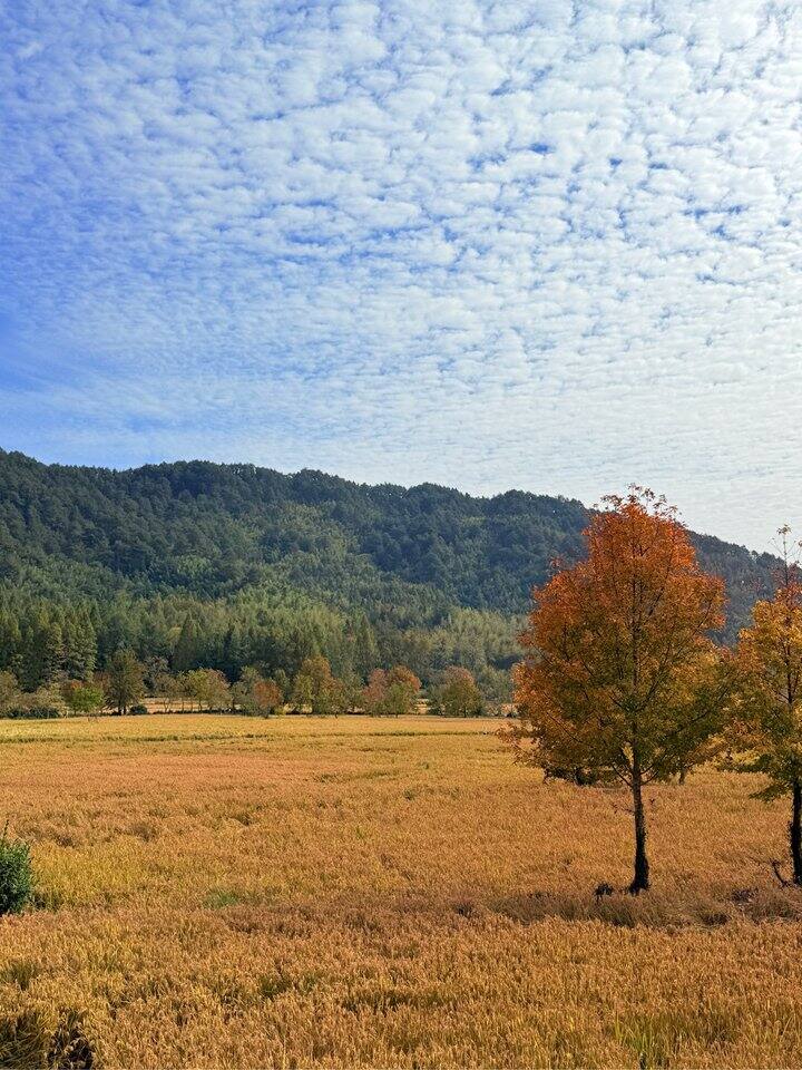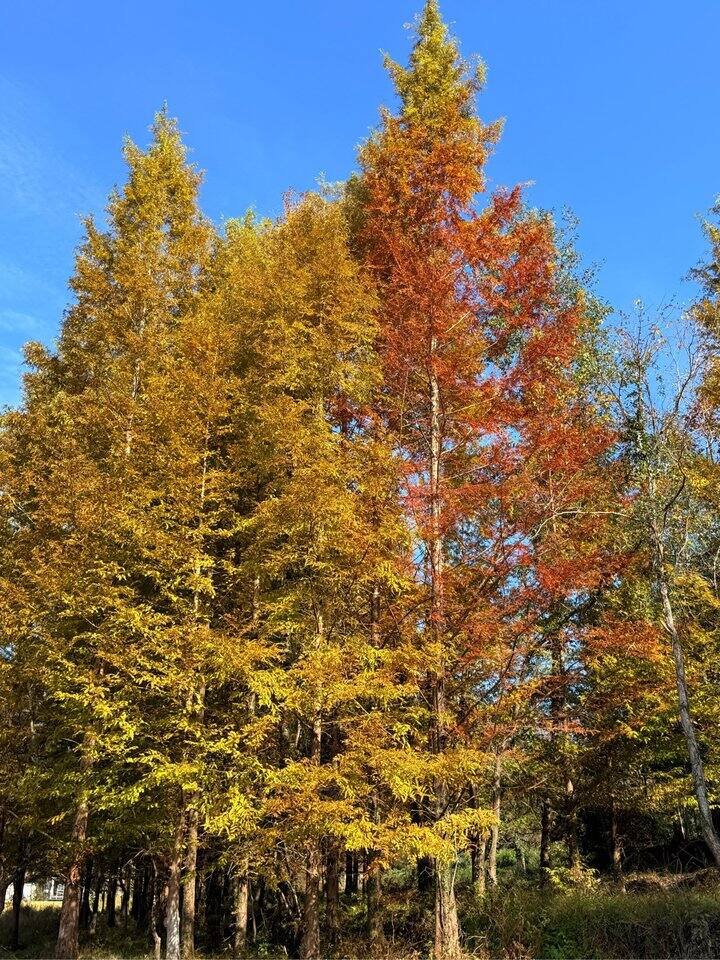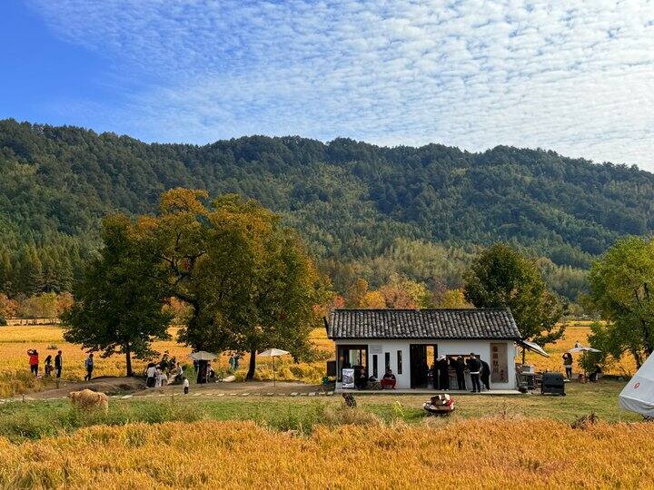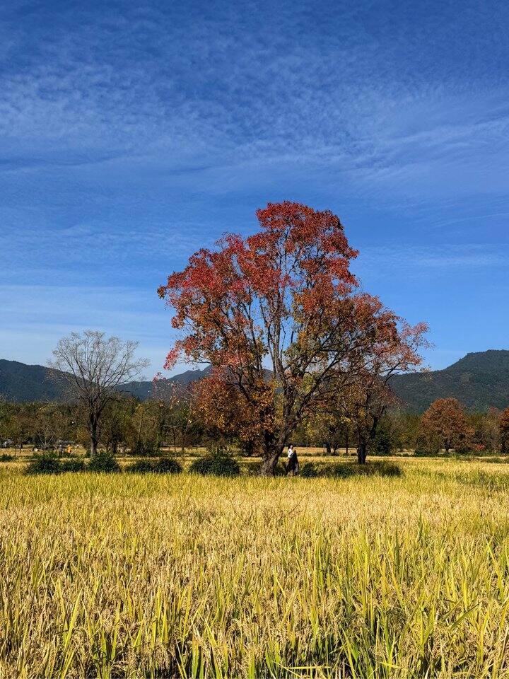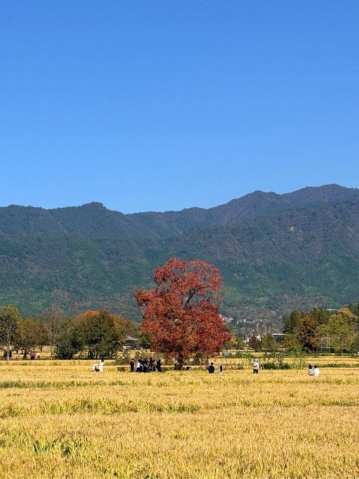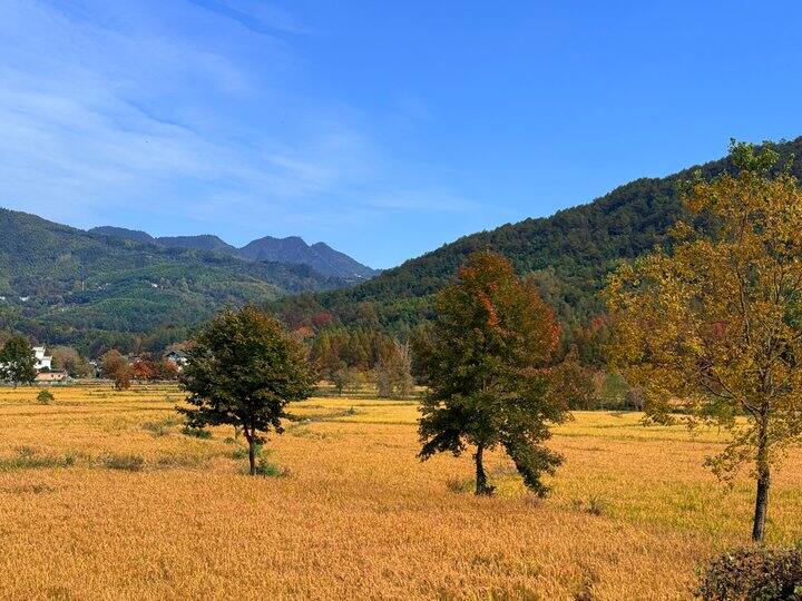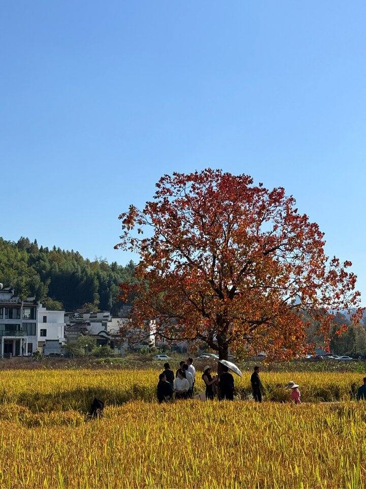 游客很多,路上都堵车了,但是稻田金黄,乌桕树五颜六色