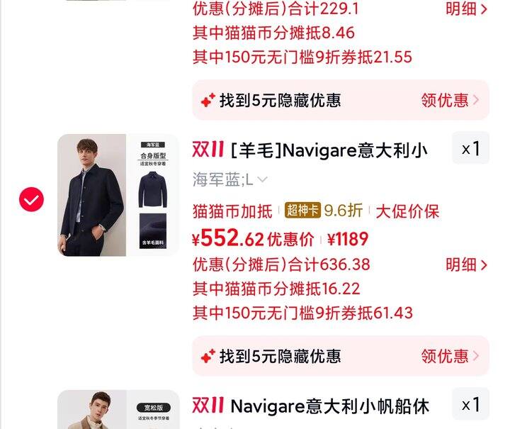 1、[羊毛意大利小帆船秋冬休闲茄克男蓝色新款https://m.tb.cn/h.SHM4ZQr弹190礼金,淘金币页面加购