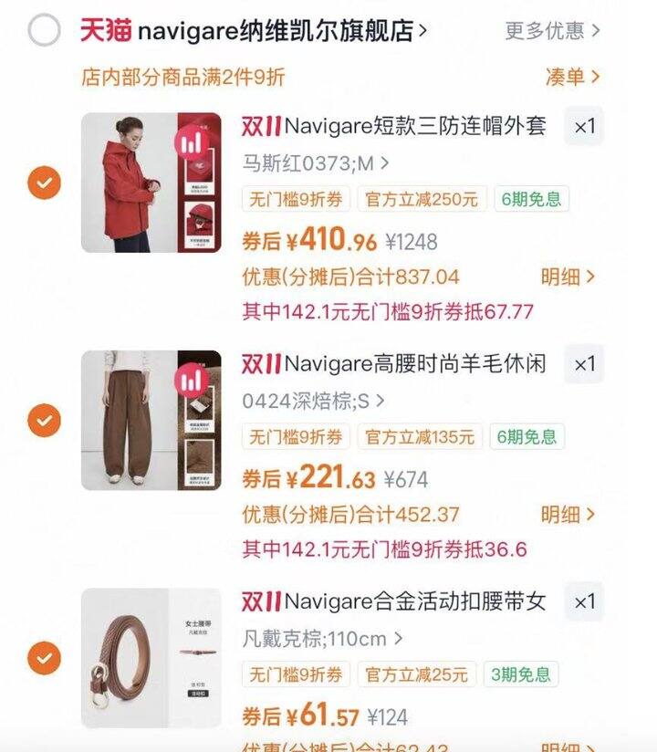 叠加9折消费券, Navigare小帆船冲锋服到手410.96,羊毛休闲裤到手221.63,充值购物金再打94折,最终冲锋服到手386.3,羊毛休闲裤到手208.3;