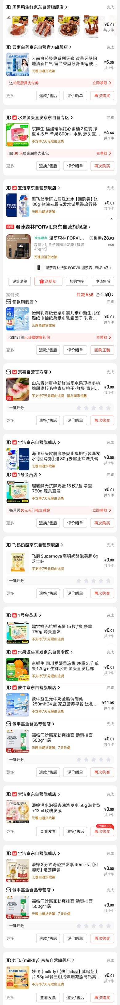京东这次双十一买的生鲜最多,就没领过111-11和300-30,很多车只能看看。每周必抢的4.9元15枚鸡蛋,只要抢得到无限回购;64.52(再返30元京豆)入了一个贝因美的母婴级恒温水壶,囤着明年宝宝出生就可以用了;13元3瓶挤挤装的蚝油,大促就是各种搞批发😃;6.99两包雨森的洗脸巾,这个其实不是纯棉还会掉絮,不适合给宝宝用,大人用用还是可以的;9.9两个的京鲜生蜜柚,前后买了8单,好吃水分很足;17.8一份的月盛斋羊肉卷,之前30买过一份做了葱爆羊肉,超级好吃,肉质很好;51元3.3斤白虾,价格还可以;15.11的碧柔洗面奶,懒人就喜欢用直泡型的;中了两片NB纸尿裤的免费试用,现在可以开始囤各种母婴试用装了;9.9三斤哀牢山冰糖橙,水分很足;29.8六盒周黑鸭,后面又降价到2-3元一盒了;队友临时点名要的云南白药牙膏,14元65g好贵;3.9的海飞丝洗发水旅行装,消灭红包;29两瓶的温莎森林发膜,这个品牌经常做活动,之前买成60还没用,这次再平平仓;1.95元400抽的怡飘云柔巾,好便宜;消灭红包1.01买的两个青州蜜桃,个头很小,味道一般;9.9三斤的爱媛果冻橙,有点酸,可能还没到季节;24元24盒的纯牛奶,每天一盒补钙;1.9一袋的挂面,囤着吃;2.9&3.9的潘婷发膜试用装,消灭红包;4.9元5片芝士片,准备用加到火鸡面里吃