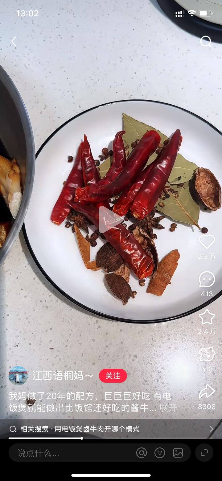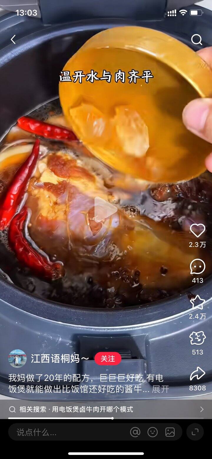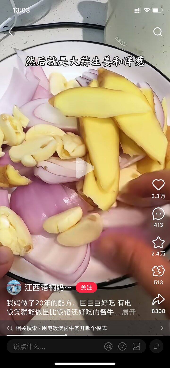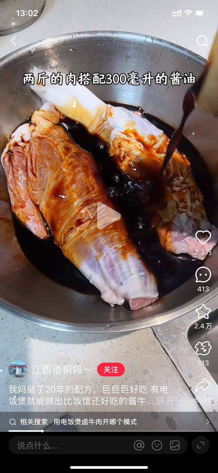 5️⃣1斤牛肉半勺豆瓣酱(就欣和那种,不是四川红油的),2粒冰糖,加开水与食材平齐,压力锅45分钟,电饭锅2小时