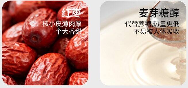 红枣:个大饱满,肉质厚实,滋味甘醇。《神农本草经》记载红枣能“安中养脾,平胃气”,为黑芝麻丸注入一抹温和清甜。再加以麦芽糖醇:润色增味,替代传统蔗糖,甜味纯正,升糖指数低,轻享甘润低负担,更适合现代人健康需求~