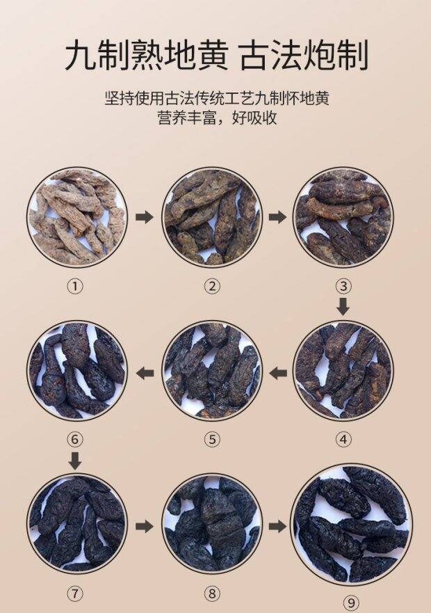 熟地黄更是传统滋补方剂中常居君药之位,被历代医家所推崇。《本草纲目》记载熟地黄:“填骨髓,长肌肉,生精血,补五脏内伤不足...利耳目,黑须发”。我们熟知的六味地黄丸,核心成分便是它。清代《药品化义》记载:熟地黄“安五脏,和血脉,润肌肤,养心神,宁魂魄,滋补真阴,封填骨髓”,为圣药也~