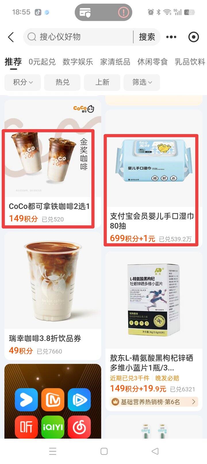 zfb会员积分可兑换必胜客汉堡,coco咖啡,湿巾等,多往下翻按需兑换