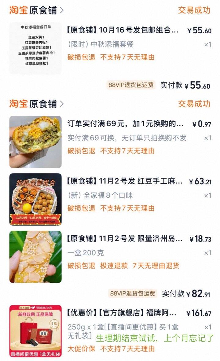 1.原食铺 蛋黄酥:路口之前那个团购的博主退了之后就很久没买了,今年中秋又突然很想吃蛋黄酥,于是中秋活动买了一次,大促活动又买了一次。味道一如既往不用说。另外还是比较喜欢之前那个小饼干,这个试这个济州岛甜点,还行,一次最多吃1.5个,2个会太腻太甜。