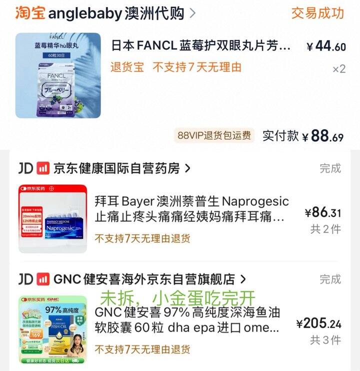 2.fancl芳珂 蓝莓护眼丸:很多年前吃过2包,感觉缓解疲劳还是有效果的,这几年换过很多牌子的护眼丸,有感觉的没几个。这次想起来这款初心,再回头试试。3.拜耳 萘普生止疼片/小蓝片:效果不错,比布洛芬起效快。