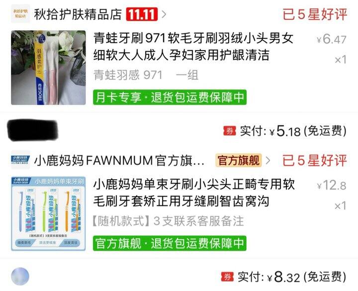 1.青蛙牙刷971:看路口推荐的,因为想要找头小一点的牙刷,比较能刷到后槽牙边边。用下来还挺不错的,刷毛软硬适中。2.小鹿妈妈 单束牙刷:买的尖头,新家没放冲牙器,偶尔用它清理一下牙缝。