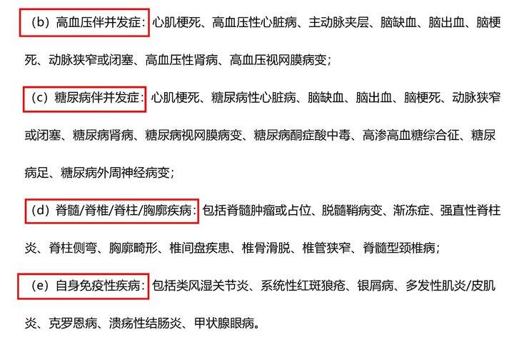 高血压伴并发症、糖尿病伴并发症、脊髓/脊椎/脊柱/胸廓疾病和自身免疫性疾病,也有相关的规定。