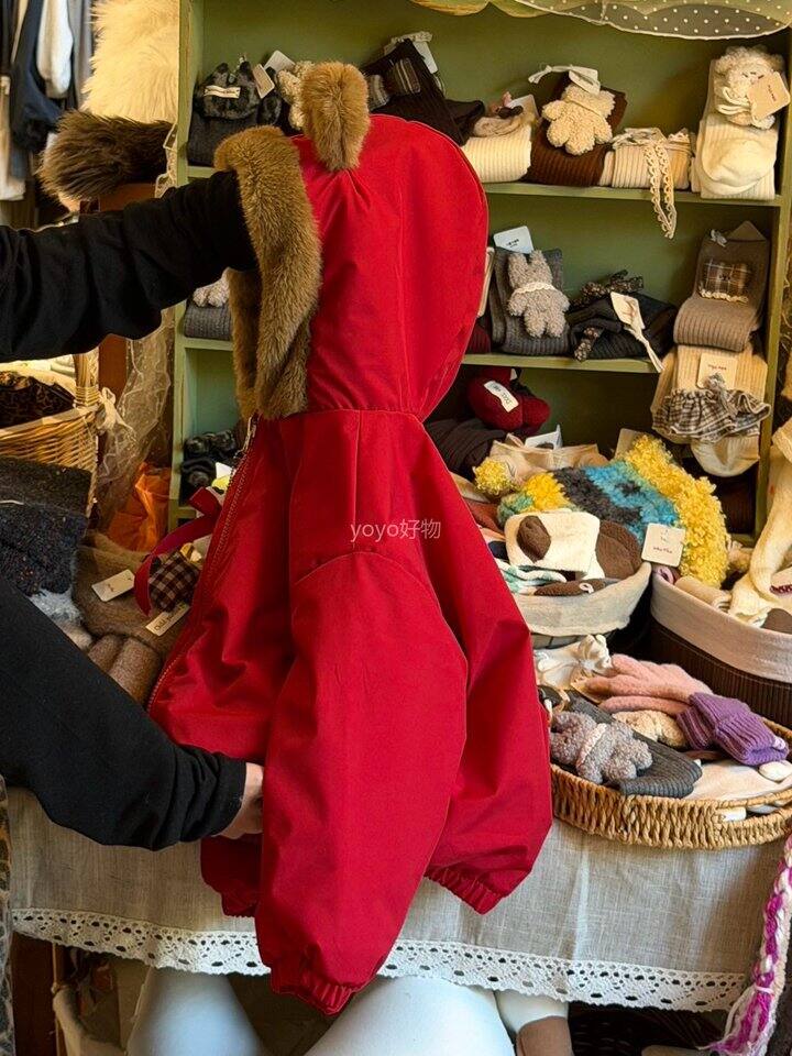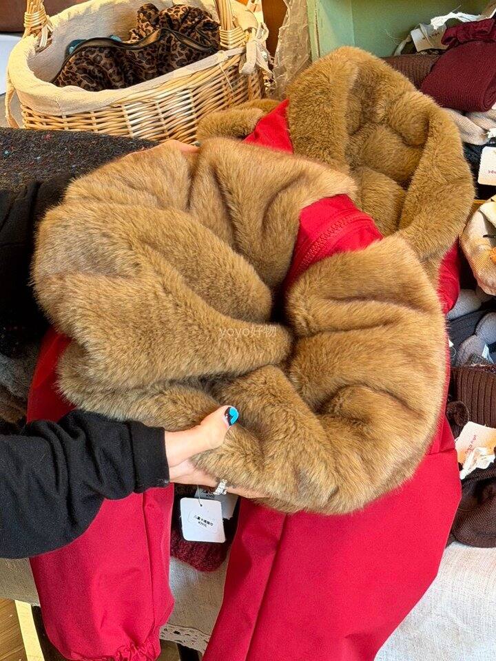 酒红主色+蓬松毛绒领,内里那个绒真的绝了