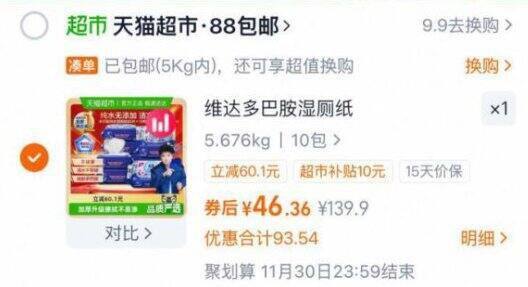 TB【46.36】维达.多巴胺湿厕纸80片*10包,详情页进入超级补贴购买,非88会员贵2.5