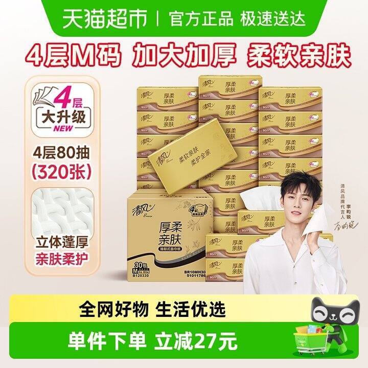 TB【23.24】清风.金装厚柔亲肤抽纸4层80抽30包,需叠加2.02淘礼金,下拉详情页点“淘金币大额补贴”跳转页面购买,非88vip贵1.45元