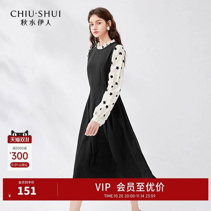 秋水伊人法式复古拼接长袖连衣裙118