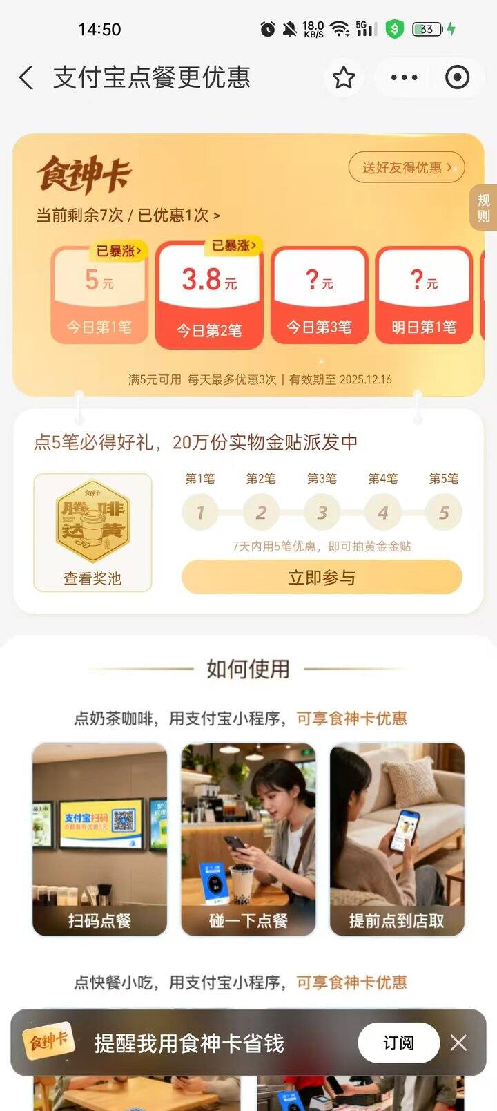 支付宝食神卡5元立减