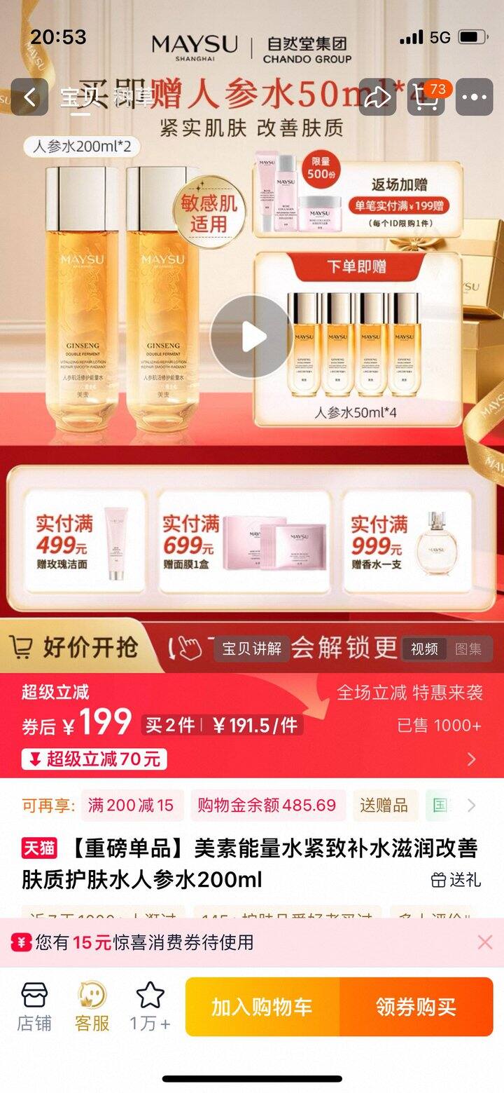 200ML一支,11/18号天猫旗舰店购入,保质期到2029/10。适合30岁以下的姐妹使用,65一支包邮,两支120包邮