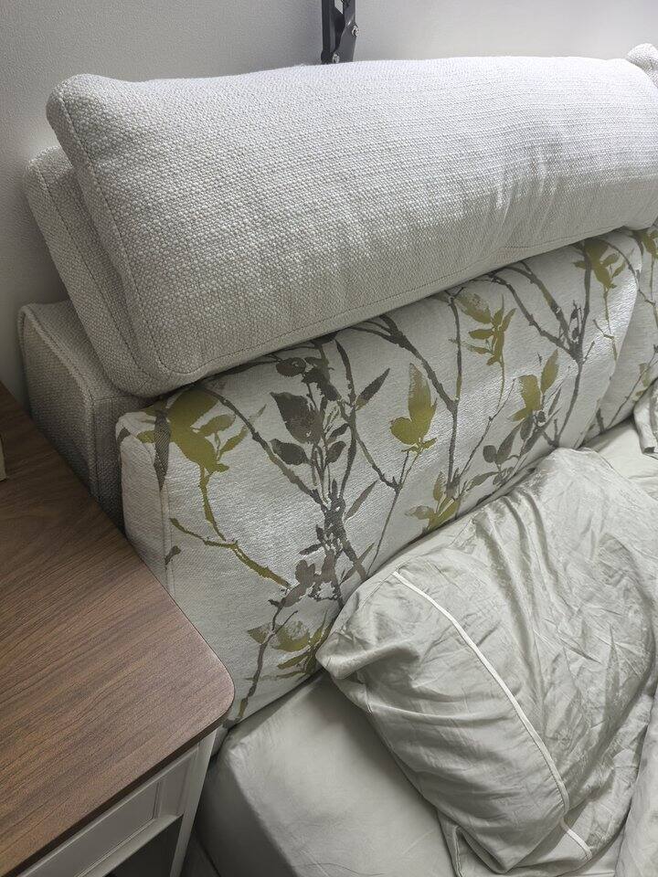 这个床是我老公认识我之前,他自己选的,品牌是爱依瑞斯,后来因为我们一直住在我那套房子里,他选的这套家具(除了床,还有沙发,电视柜,茶几。电视柜和茶几用不上,我给出闲置了,只留了沙发和床),一直放在人家库房里,家具店多次打电话,说占他们库房太久,才在四年前搬到新家,我看到的时候,非常不喜欢,直男审美,太丑了,本来卧室就小,床头还整那么厚的,非常嫌弃,还想着要不重新买床吧,考虑新床出闲置太亏,再加上我闺女太小,用新家具会有甲醛问题,最终还是留下来了,用过之后,被啪啪打脸,这床可太好了,完全可以忽略它的丑了。1.床头是有坡度的,再加上靠垫和头枕是羽绒的,靠在床头是非常舒服的,特别要说一下,羽绒靠垫的舒适度真的非常好。