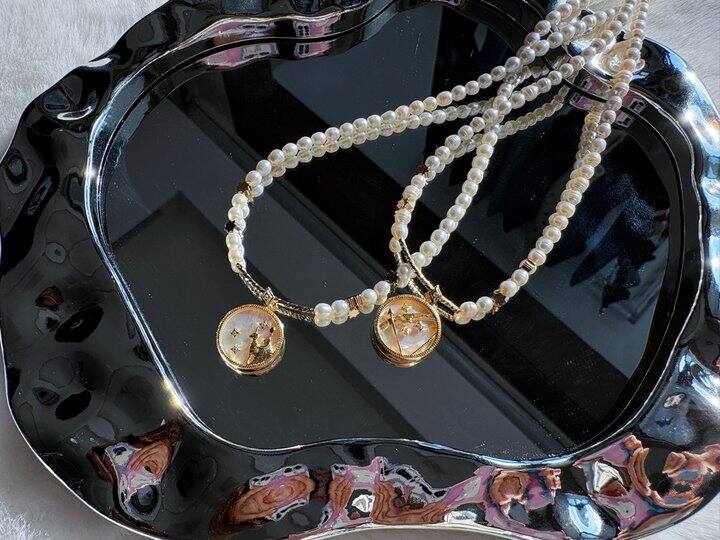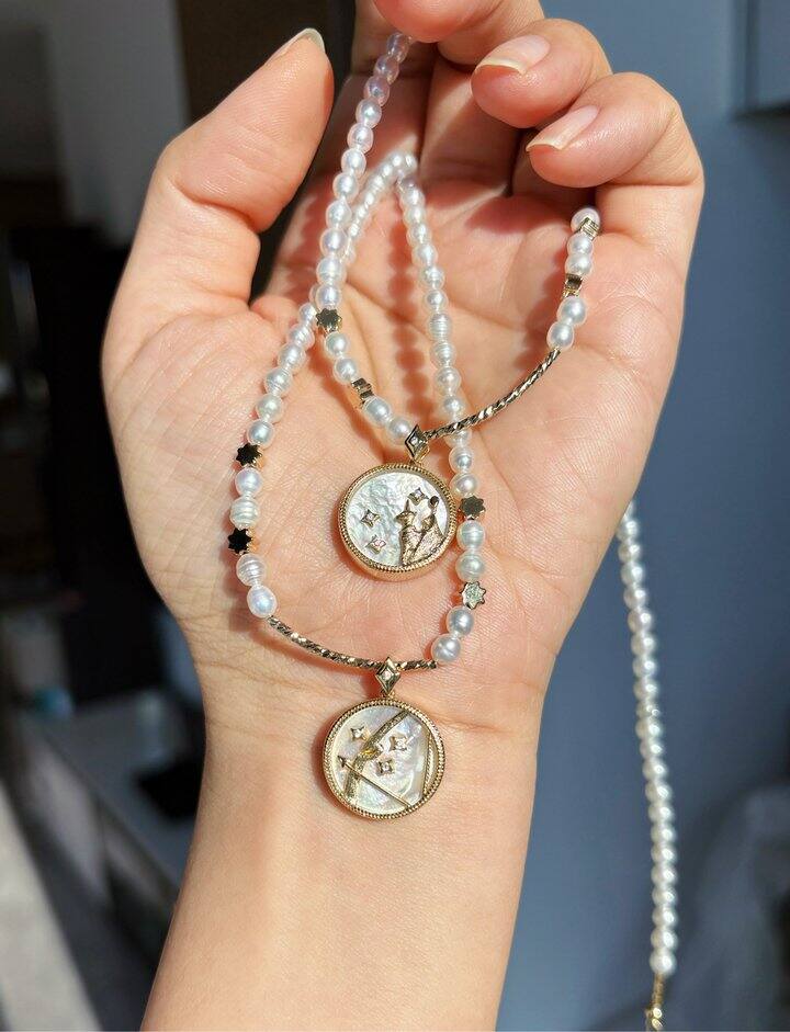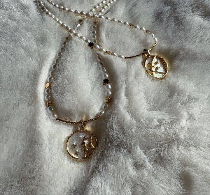坠子是厚实贝母底星座吊坠,做工精细,吊坠链接部分是我的小创新,能随着动作轻轻晃动。