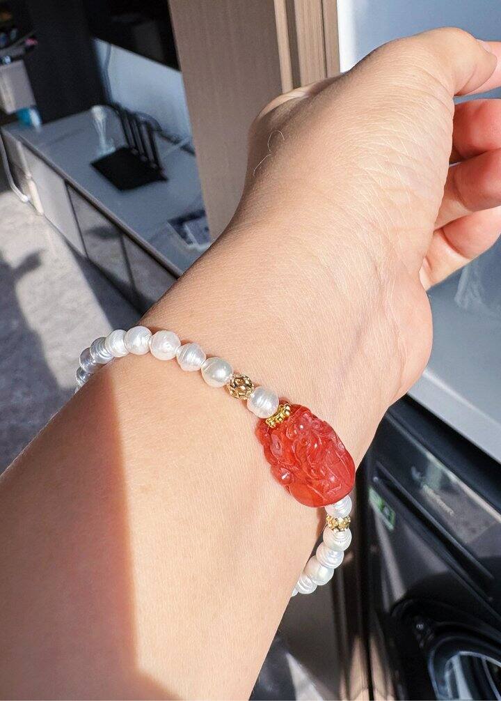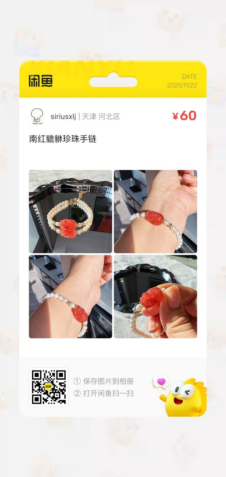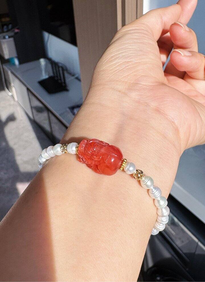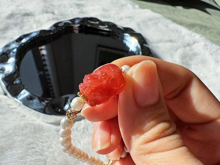 南红冰飘貔貅,雕刻的算很精细了。之前我半张毛爷爷出过两条类似款,但这个貔貅比之前的大而且料子也更贵雕工更细,所以贵10块,这种小雕刻件单独一个都要三四十块了