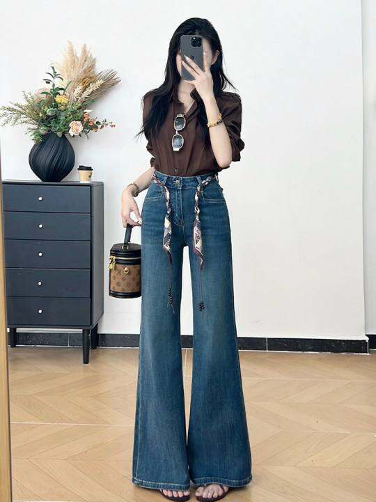 乔栈秋季新款覆古设计感不贴腿微喇牛仔裤女高腰遮肉显瘦气质喇叭