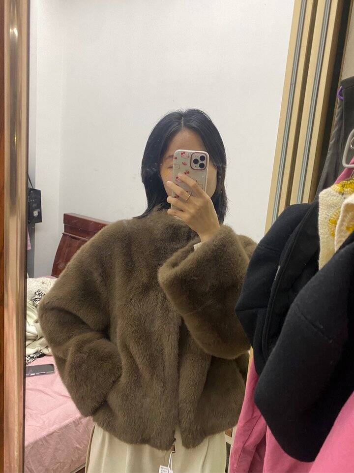 外套挺暖和的,广东过冬足够了,里面是麂皮的,就是棕色毛毛有点泛白,背面挺好看挺显瘦的(当然我也不胖)买的m码