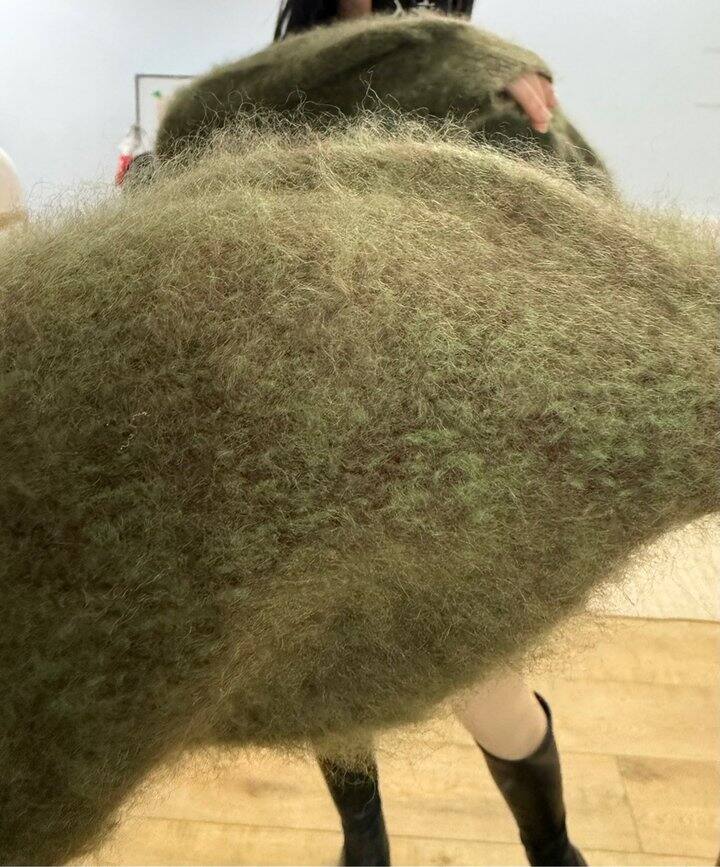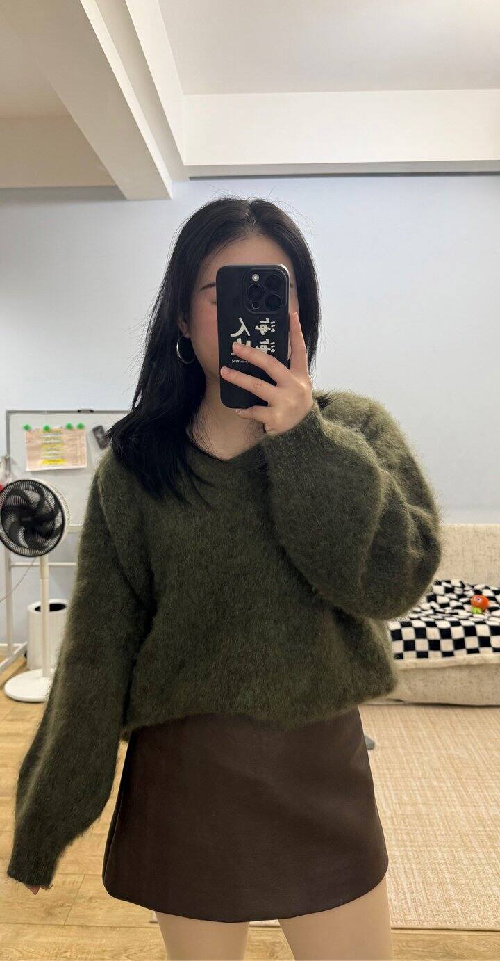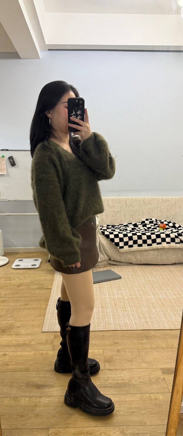 昨天到的今天上班就穿上。颜色森林绿,搭配棕色皮裙,毛衣有点长,这种毛衣应该是宽松的比合身的更显瘦。圆身🐻大上半身有点点显胖,不过很软又暖,穿着也蛮满意的,就留下了。