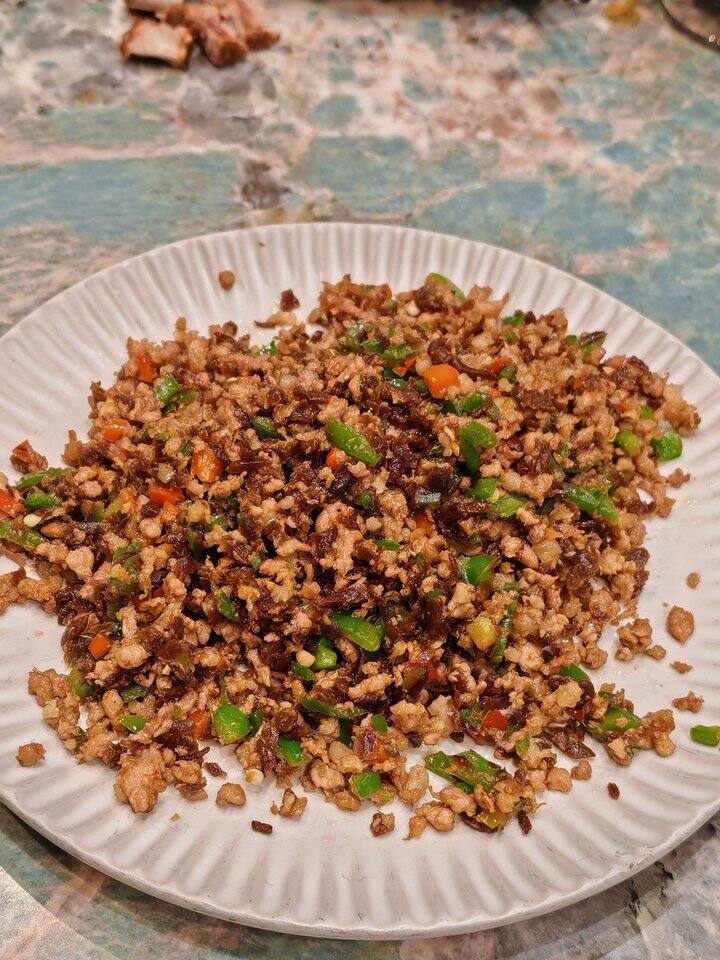 还有一个水腌菜拌腊肉,腊肉很多都是肥的,有点腻