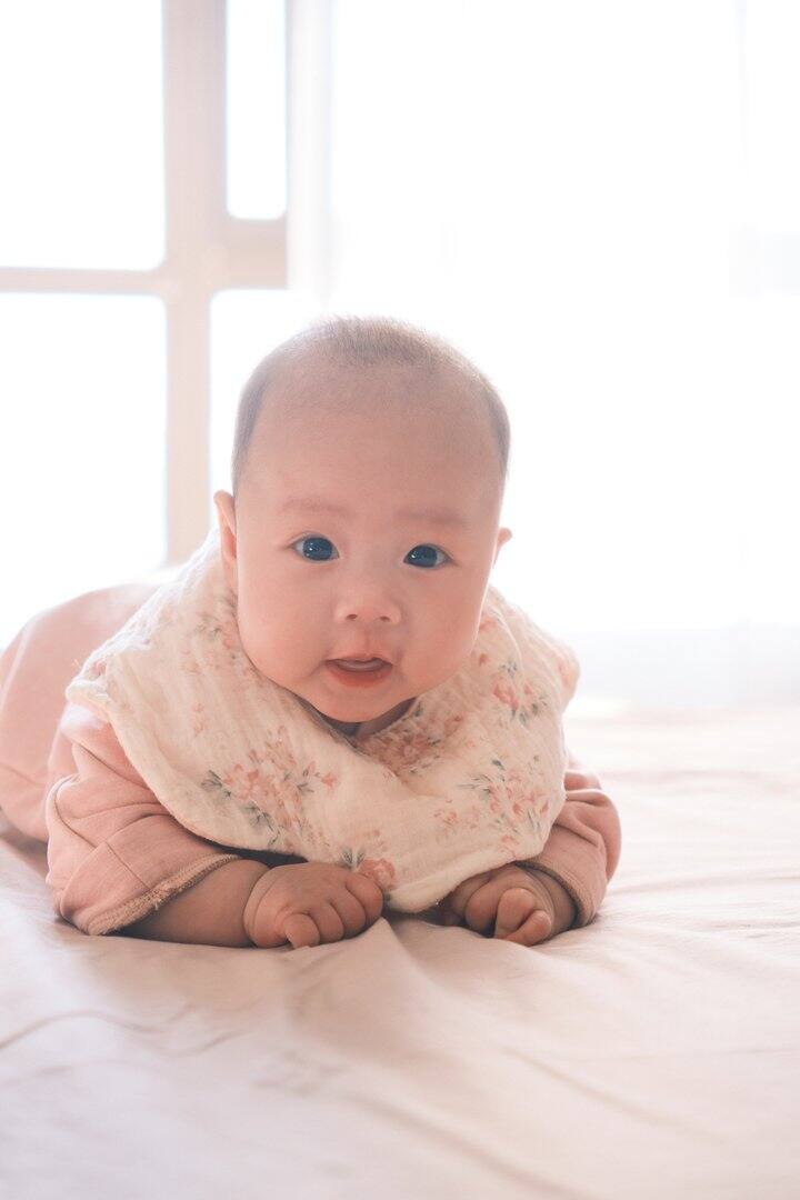 小孩极有运动天赋,在三月龄的某一天,我试了下让她翻身,她小手拉着我的手,自己用了点力气,就这样翻过去了,这可比我强多了。