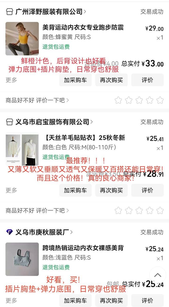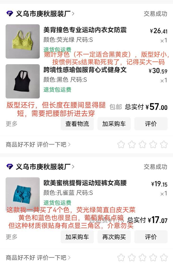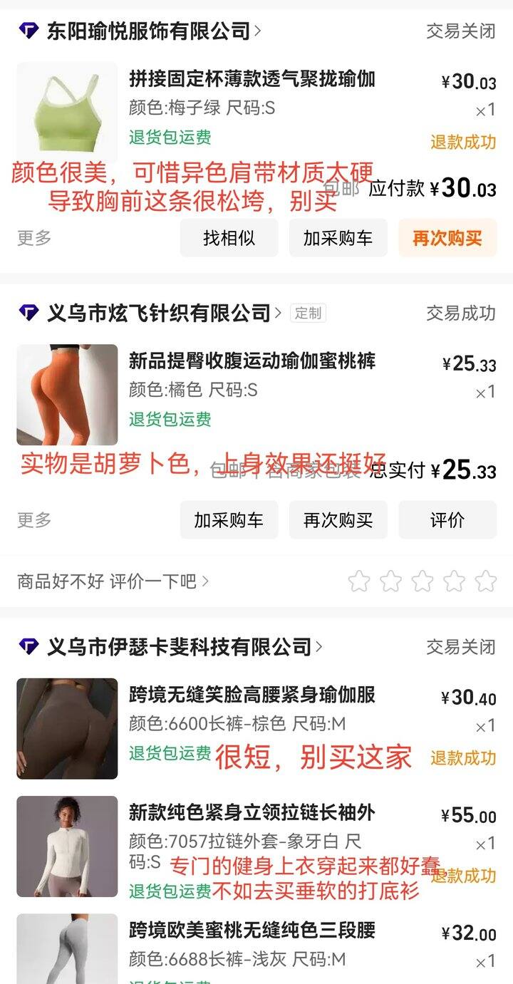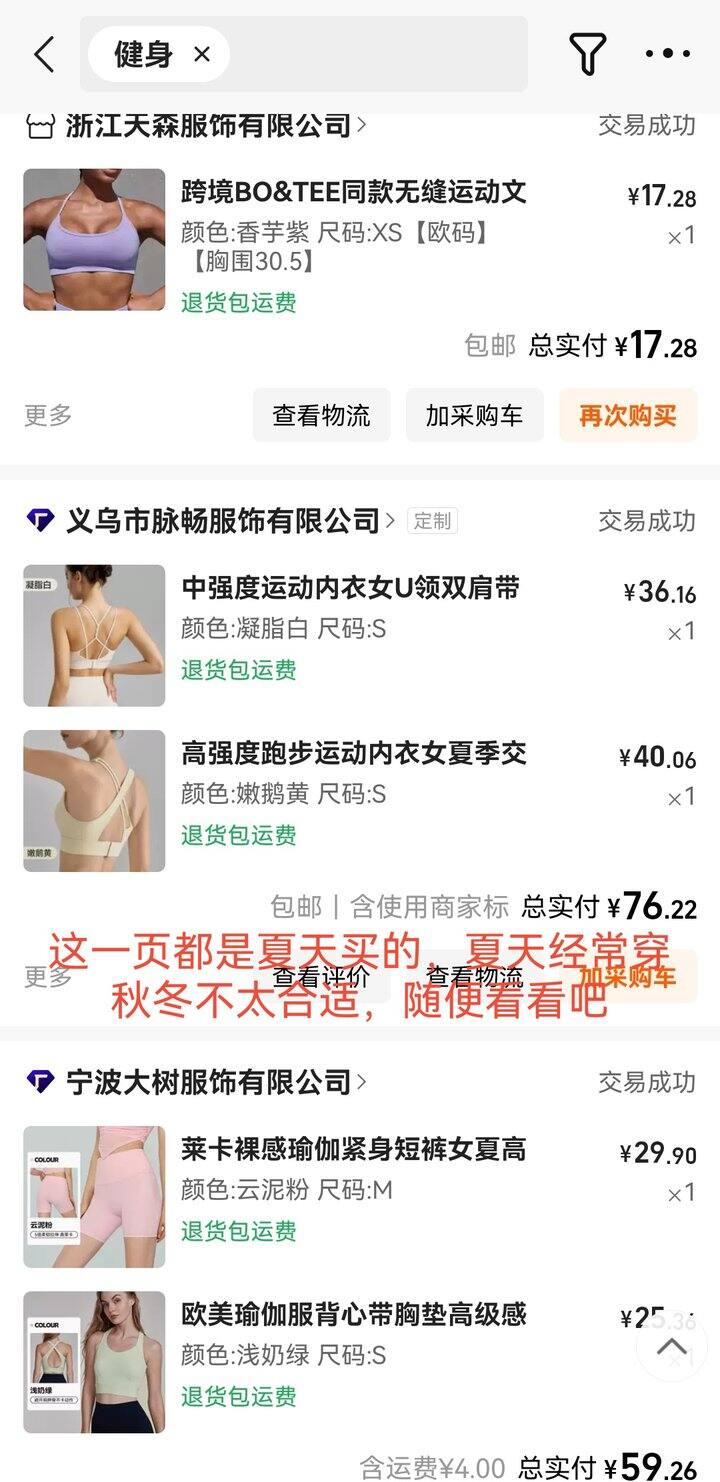 最近在穿的主要是这些,购买记录在最前面,按颜色找就行。以下都是夏天的,裤子有点凉不太适合秋冬,运动内衣还可以继续穿,购买记录也放在最前面。