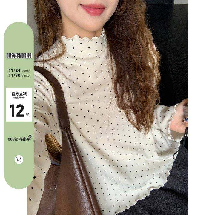 陆小团团甜美木耳边波点打底长袖2025冬季新款韩系温柔内搭上衣女