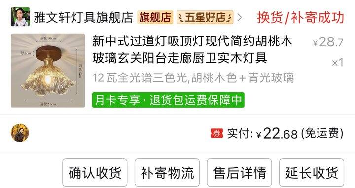 玄关灯,很便宜,很美丽,第一次寄来灯罩碎了,商家很快补寄了,质量可以