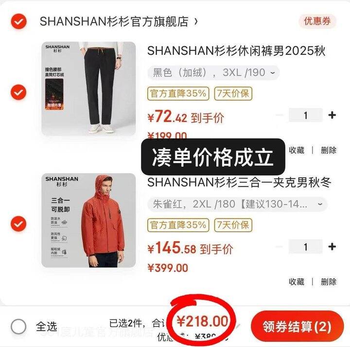 杉杉 三合一冲锋衣➕加绒长裤💰218