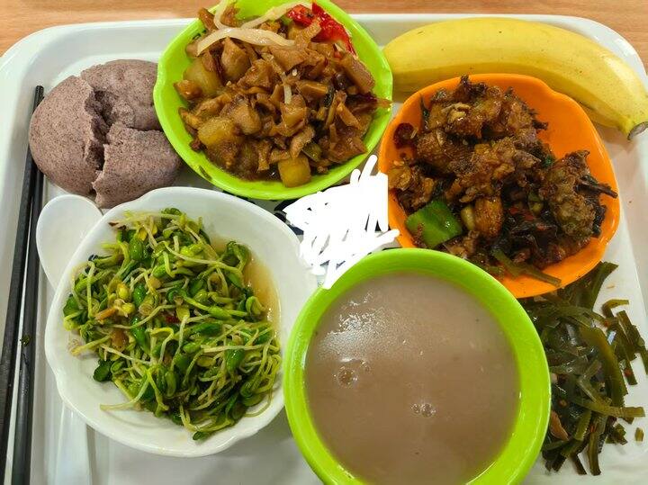 午:辣子鸡+冬瓜烧肉+炒豆苗+粥+馒头