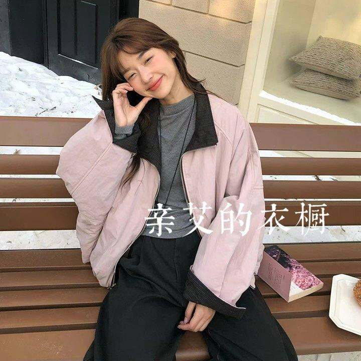 H.one正版2597~冬韩国宽松显瘦格子翻领撞色两面穿棉服棉衣外套女