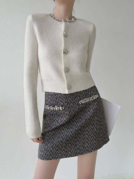 圣多墨 圆领通勤气质名媛修身小香风订钻针织毛衣外套+半身裙套装