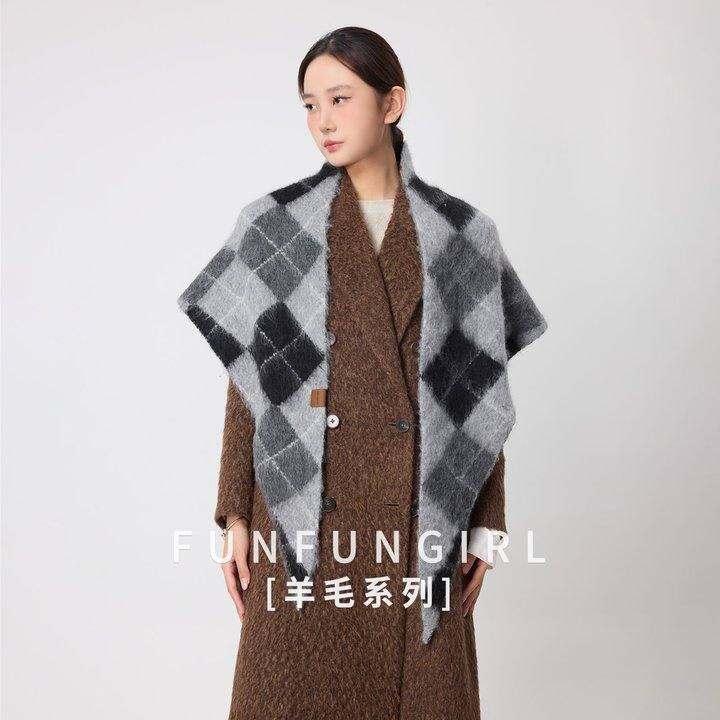 韩系2025新款复古菱形提花格子棉羊毛三角巾秋冬女高级感保暖围脖