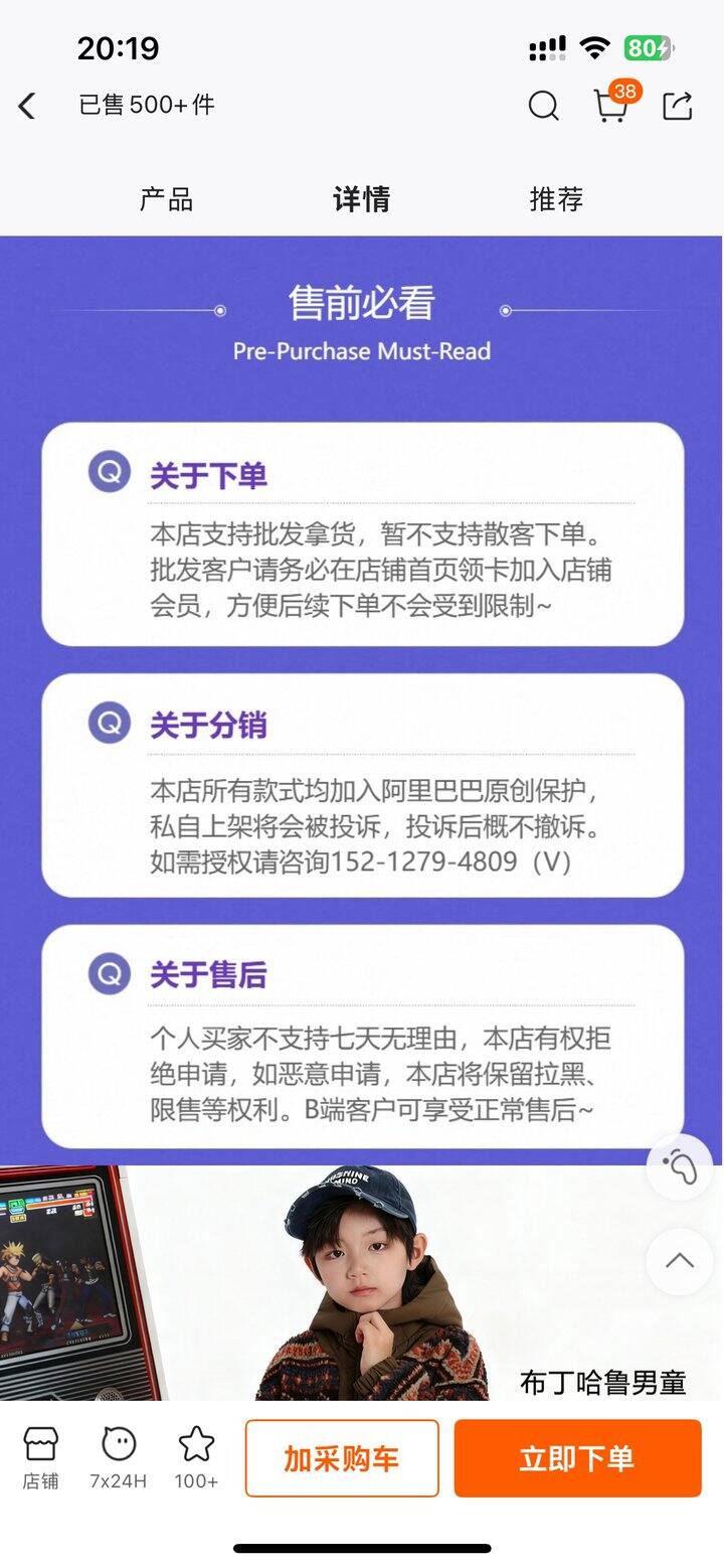 这家是我在1688买到的一家童装店,款式好看质量也好,现在只接批发,单独购买不能退货,淘宝有的童装店转卖的就是这家的衣服,可是货不全