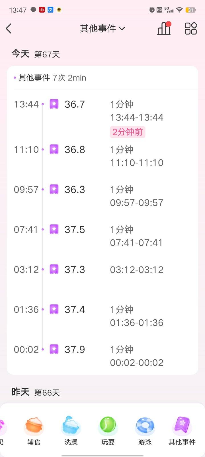 前天去打了两针疫苗,脊灰和百白破,当天下午和第二天睡觉都很多,开始没当回事,以为是这两天变乖了,第二天傍晚我觉得不对,宝宝醒着时候也没那么之前活泼,一测水银计38.3,给我这新手妈妈给吓得赶紧给上班的老公发信息,他还比较淡定,叫我不要慌,喂点水,做下推拿,之后37.5,很开心,一小时再量38.4了我又慌了,这时刚好老公也回来,我继续给宝宝推拿、温水擦拭喂奶,心理很没底,叫我老公闪购了退热贴(这玩意争议很大),买回来贴上,我继续一小时就量一次体温,做又一轮的退热操作,知道今天上午温度才降到正常,测了好几次正常我才放心了。