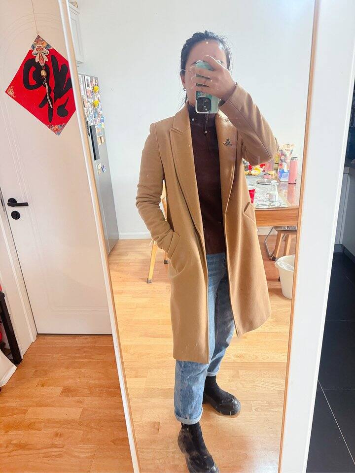 这个驼色大衣还是我出国时候在瑞典买的,zara的羊毛大衣,100%羊毛,袖子非常非常窄。