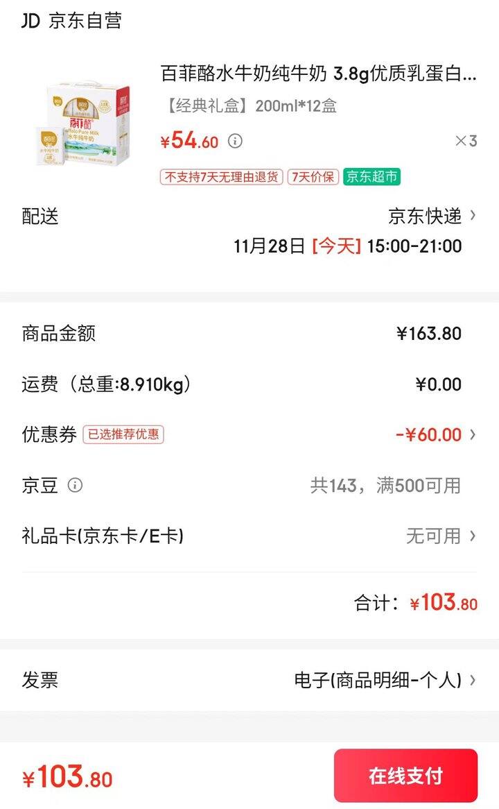 【自营】百菲酪 3.8g水牛纯牛奶200ml*12盒