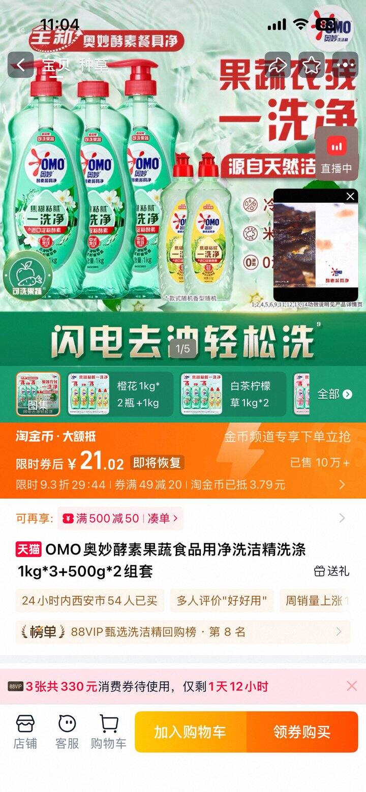 没有88vip直接拍也是好价!!!【22-26左右】到手奥妙洗洁精洗涤1kg*3+500g*2组套共8斤