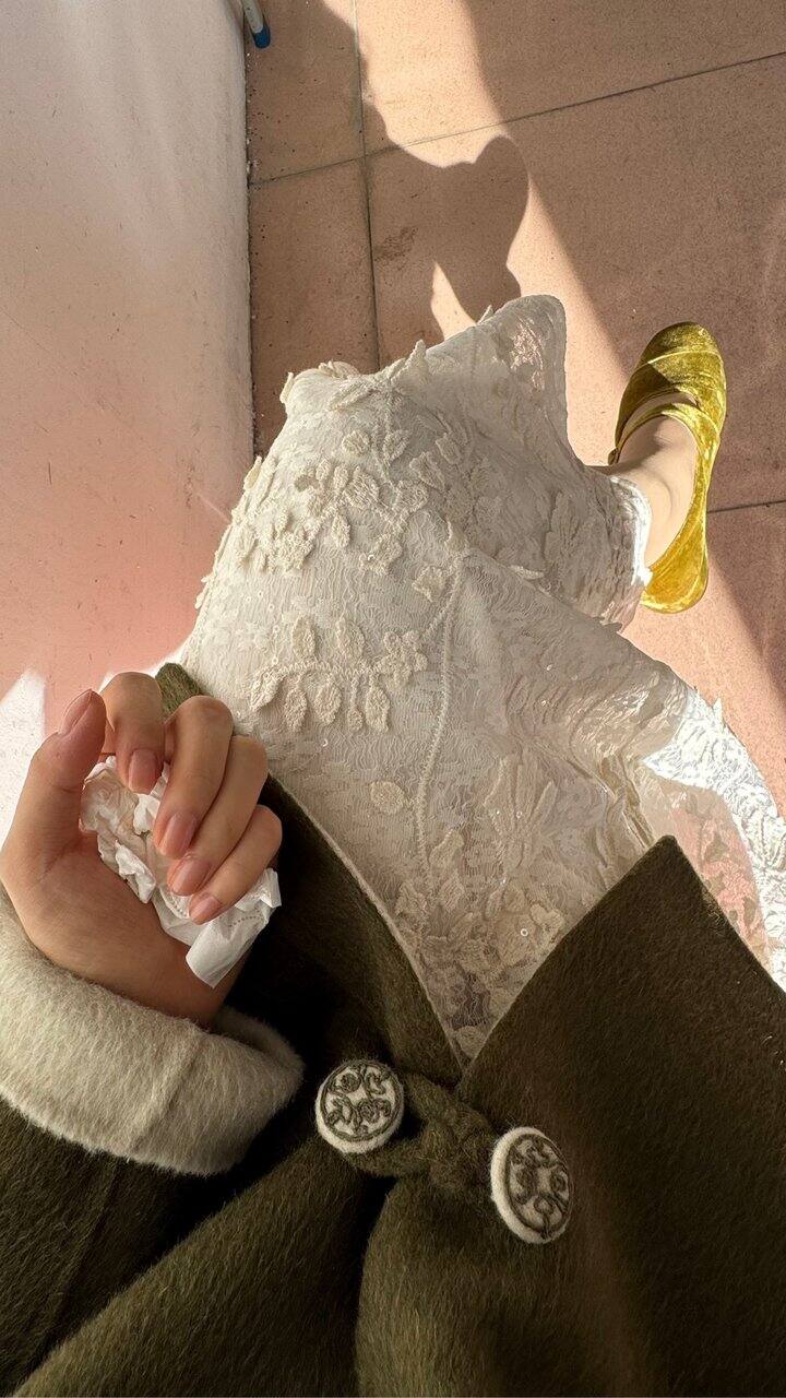 图四的上衣也是固执的短款绿色呢子,跟图一那件一起买的,试穿这俩衣服的时候,男朋友一看马上说好看,给你钱都买。裙子🍑的,绿色丝绒单鞋是迷路森林(好像这个,但是下架了)